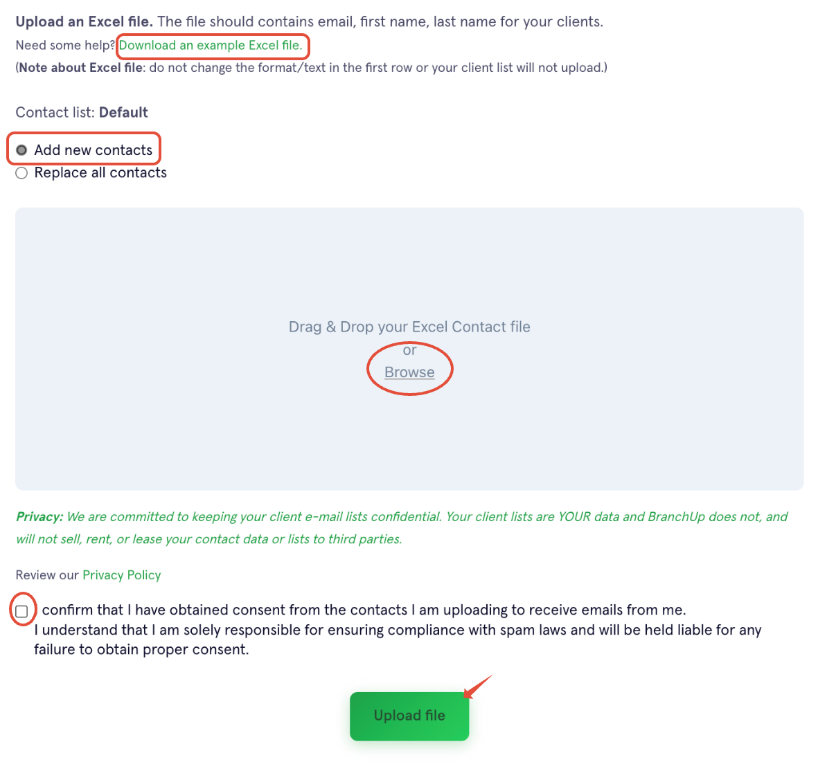 - 'Drag & Drop' your Excel Contact file or 'Browse' for the file