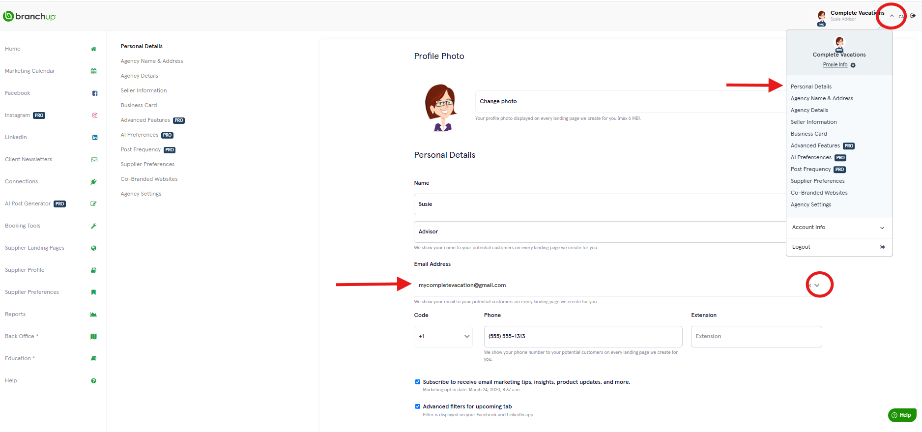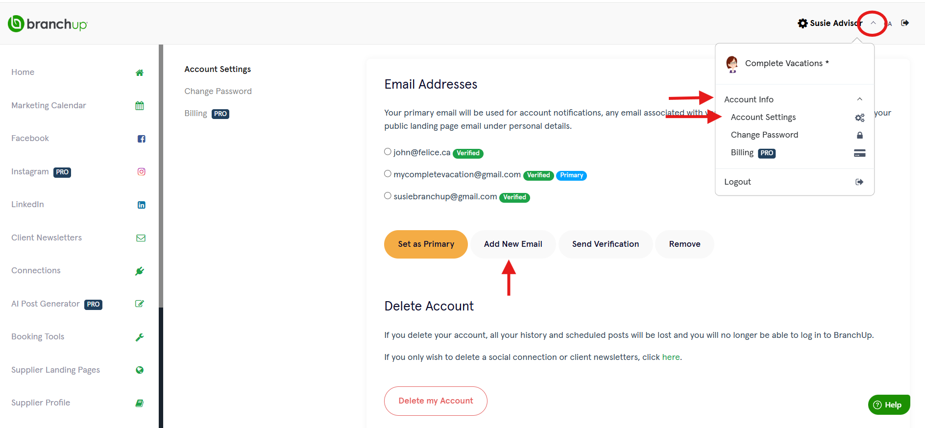 - Click ‘Account Info’ -> ‘Account Settings’ -> ‘Add New Email’ -> Enter new email address