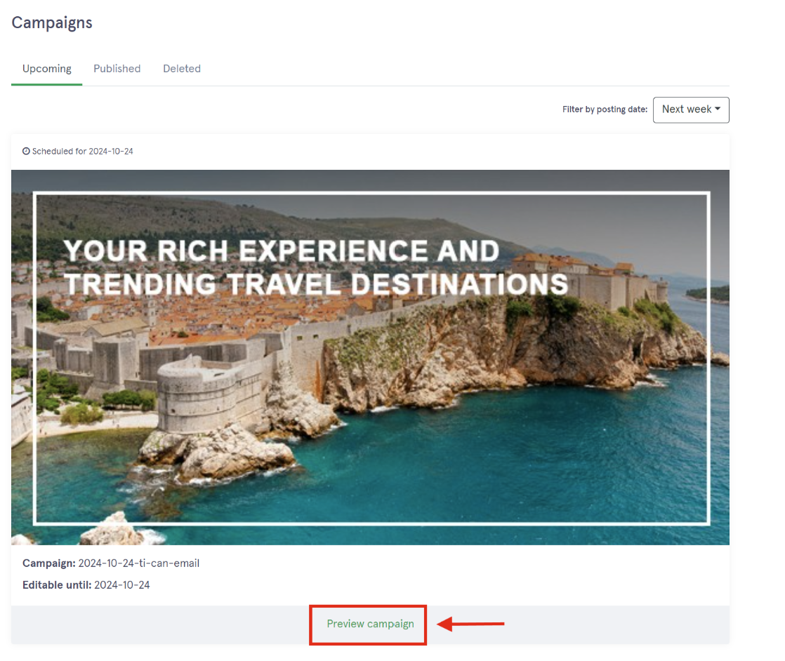 - Click 'Preview Campaign' under the 'Upcoming' tab in navigation menu on the top