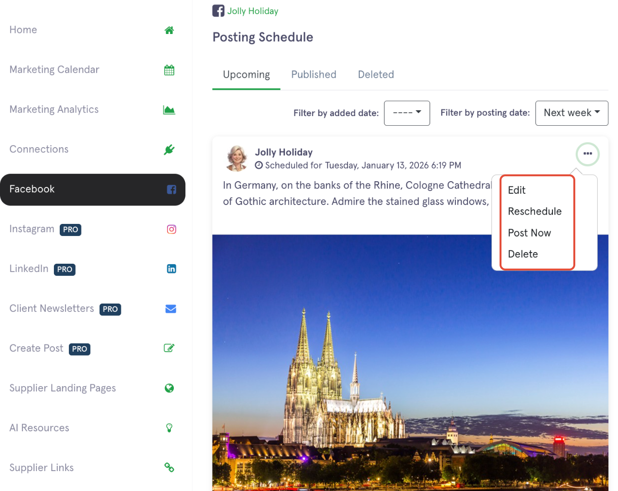 - Choose the option to 'Edit, Reschedule, Post Now or Delete' a post