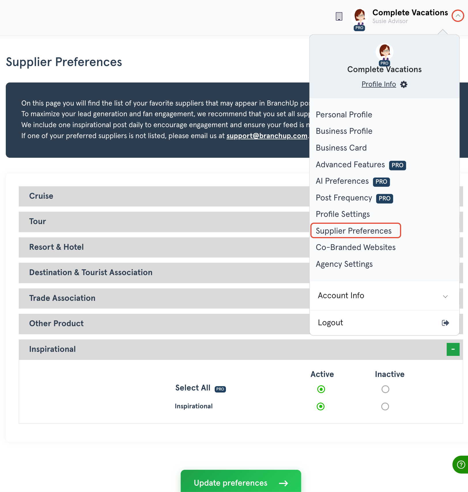 - Click ‘Supplier Preferences’ from the drop-down menu